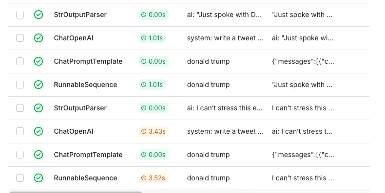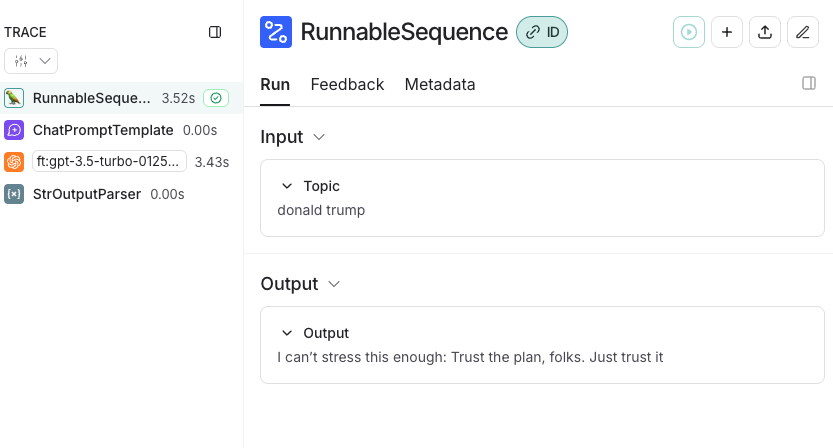 local에서 app.py 를 실행하고 topic 에 donal trump 를 입력하였을때 파인튜닝된 모델이 좀 더 장황하지 않고 단도직입적인 톤으로 생성된다는것을 확인할 수 있었다. Langsmith에서도 chatPromptTemplate, LLM 호출, 그리고 StrOutputParser를 체인으로 연결한 각 단계 사이에서 어떤 과정이 진행되는지 상세하게 확인할 수 있었다.