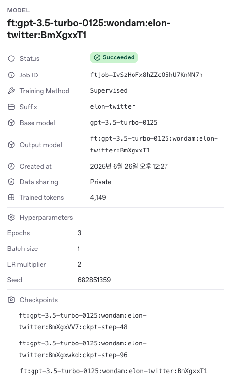 - train_model.py: 일론 머스크의 트윗 데이터를 사용하여 OpenAI의 GPT-3.5-turbo 모델을 Fine-tuning 하고