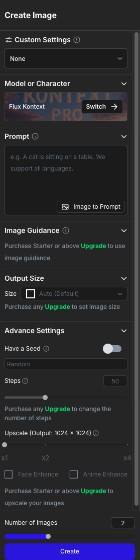 | Output Size (출력 크기) | 해상도 지정 가능 (1024x1024 등),유료 사용자는 커스텀 사이즈 사용 가능. | |