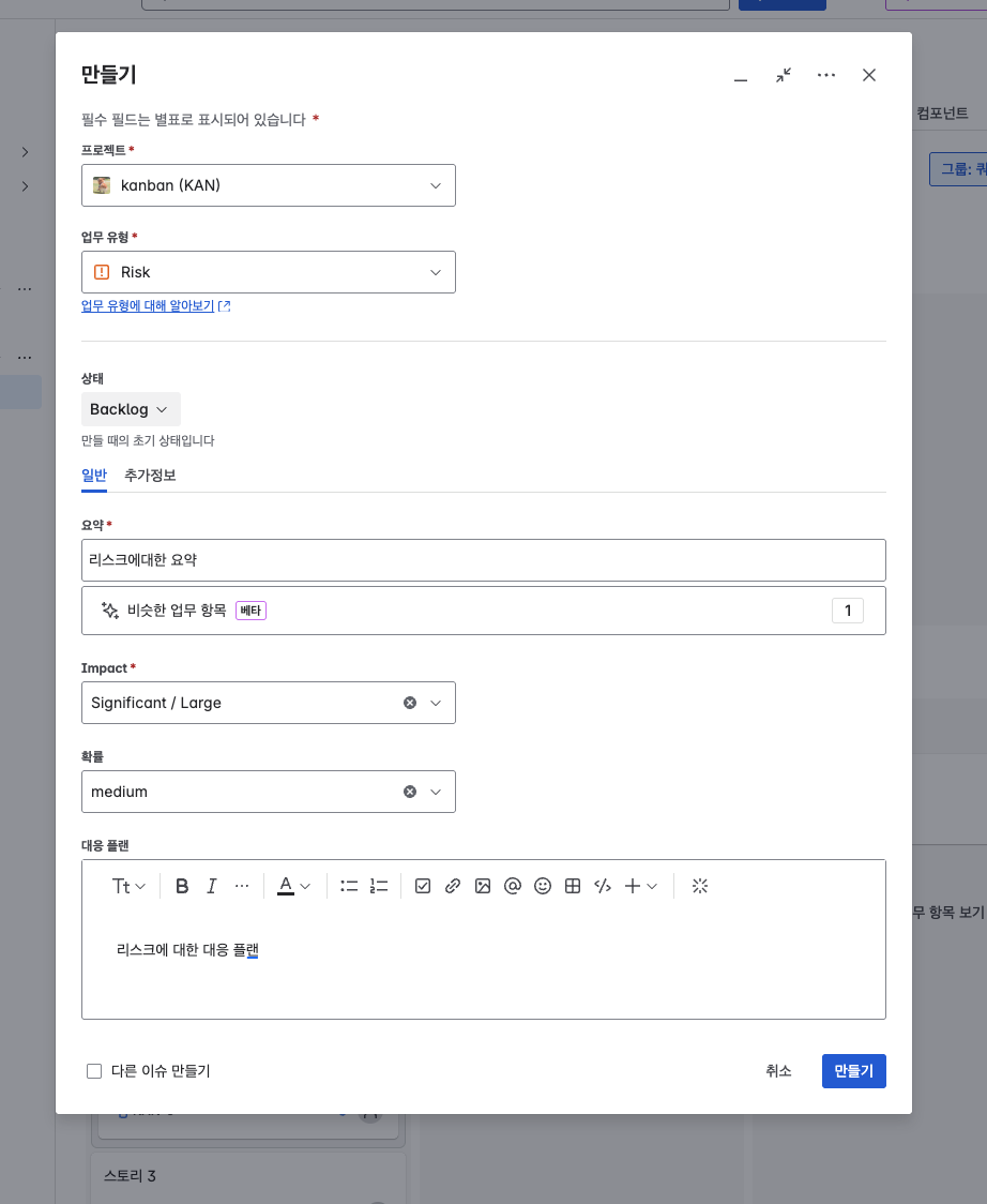 크게 해당 이슈를 Risk 로 분류하여 생성할때는 아래 3가지 요소 정도 입력이 필요하다고 생각하였다.